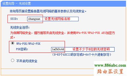 在SSID中設置無線網絡名稱,選中WPA-PSK/WPA2-PSK的加密方式,在PSK密碼中設置不小于8位的無線密碼。