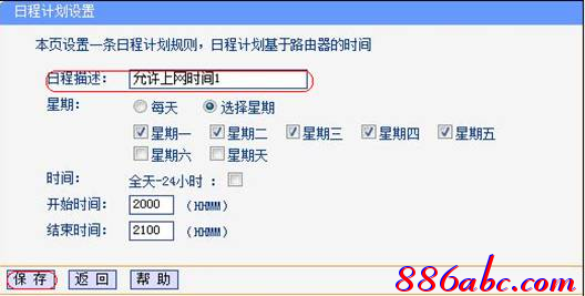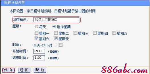 再添加一個條目:周六和周日的允許上網(wǎng)時間2(即9:00-21:00)。
