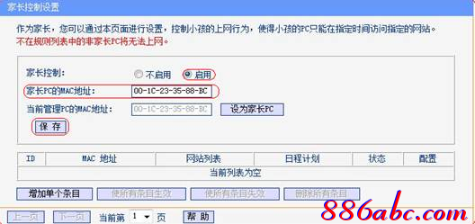選擇“家長控制”菜單,將“家長控制”選擇為“啟用”,填寫家長電腦的MAC地址(如當前管理路由器的電腦即家長電腦可以點擊“設(shè)為家長PC”),點擊保存。如下圖: