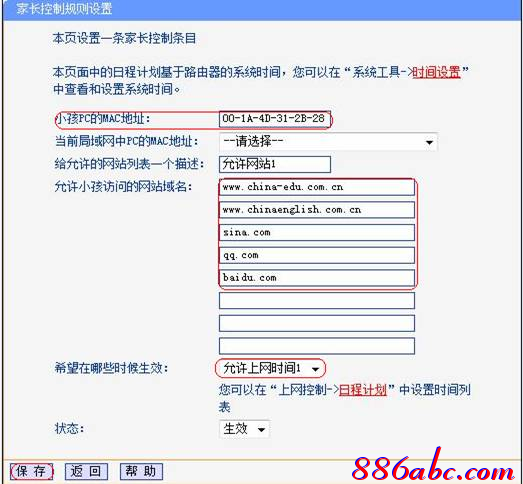 1、 在周一到周五的允許上網(wǎng)時間1(20:00-21:00),僅允許小孩(MAC地址為00-1A-4D-31-2B-28)瀏覽中國學(xué)習(xí)在線,中國英語網(wǎng),新浪,騰訊,百度等網(wǎng)站。