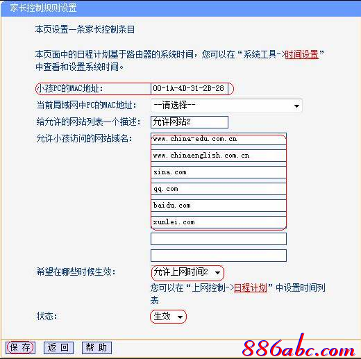 2、 在周六至周日的允許上網(wǎng)時間2(9:00--21:00),僅允許小孩(MAC地址為00-1A-4D-31-2B-28)瀏覽中國學(xué)習(xí)在線,中國英語網(wǎng),新浪,騰訊,百度和迅雷等網(wǎng)站。