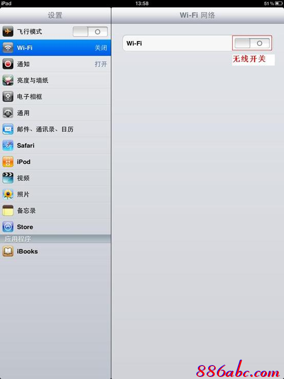 STEP1:打開IPAD主界面,選擇設置菜單,進入WIFI設置頁面。