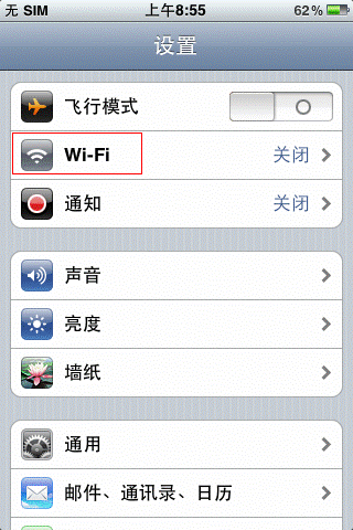 STEP1:打開IPHONE主界面,選擇“設置”菜單,進入WIFI設置頁面。
