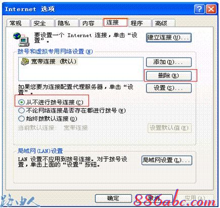 五、點擊瀏覽器里面的工具---Internet選項----連接,如果是撥號上網的用戶,請先刪除寬帶的撥號連接,并選擇從不進行撥號連接,如上圖所示