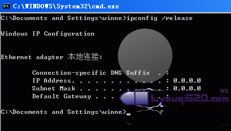 b).輸入清除IP地址的命令ipconfig/release,等待片刻后IP地址被釋放,如下: