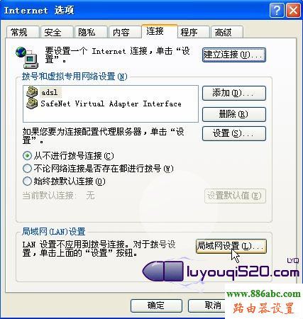 1).啟動瀏覽器打開一個網頁,選擇”工具”菜單中的”Internet選項”->”連接”選項卡右下方的”局域網設置”,將”為LAN使用代理服務器”前面的勾去掉,禁用代理:
