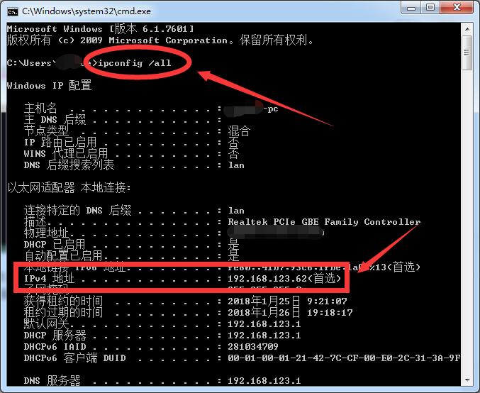 三、然后找自己電腦的IP點擊,電腦桌面上的 ?開始 ?--- 選擇 ?運行在運行程序輸入框中輸入 “cmd”(注意不要講引號也復制進去啊)進入dos界面后,大家再次輸入 ?ipconfig /all ?就會出現dos界面上邊就有顯示自己的電腦ip地址。