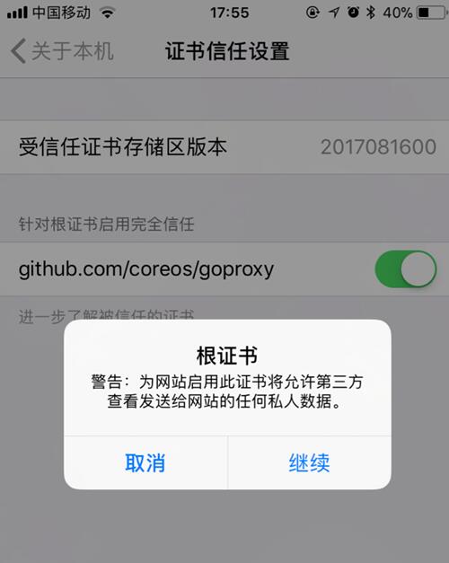 然后在設置-通用-關于本機-拉到最下 證書信任設置 點繼續然后就沒了
