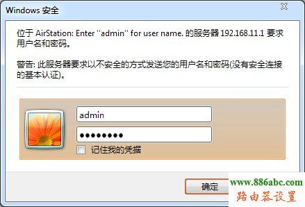 1.進入路由器web管理設置界面:打開瀏覽器,在地址欄里輸入本產品的IP地址(出廠默認為192.168.11.1),然后按回車鍵。出現要求輸入用戶名密碼的畫面時,請按以下輸入:用戶名→admin 密碼→password,點擊[確定]。 |