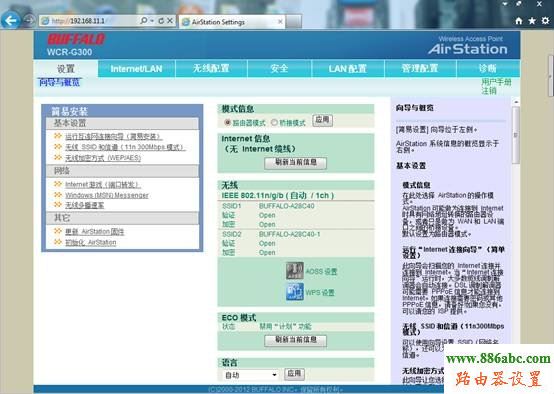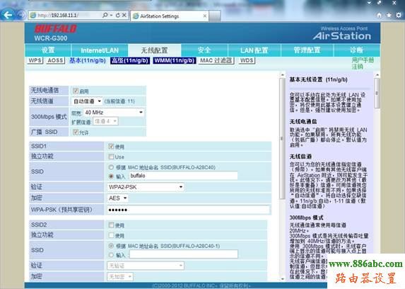| 7. 無線配置→基本(11n/g/b):啟用無線電通信,允許廣播SSID ,300M無線路由建議選擇帶寬“40MHz”。使用SSID1,SSID可使用默認設置(配置Airstation 的MAC地址***),也可在“輸入”欄中自行輸入所需設定的無線網絡名稱。選擇“驗證”、“加密”方式及填寫預共享密鑰(設置密碼)。如無特殊需求,建議取消使用其他SSID,如:SSID2等。點擊“應用”后路由自動重啟。 |