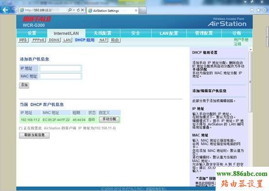 | 6.可手動添加及分配DHCP,添加或手動分配DHCP后,刷新當前信息。 操作步驟:點擊“Internet/LAN”→“DHCP租用”,輸入需添加的客戶機IP地址/MAC地址,點擊“添加”。 |