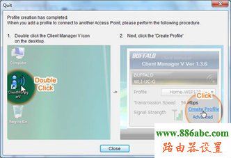 | 1.將路由器開關(guān)撥在OFF狀態(tài)。 接通電源后,可通過無(wú)線網(wǎng)卡(截圖為buffalo無(wú)線網(wǎng)卡的無(wú)線連接工具ClientManagerV,用戶也可使用windows自帶的無(wú)線連接工具連接。)尋找該路由的無(wú)線SSID信號(hào),進(jìn)行連接。使用ClientManagerV連接無(wú)線網(wǎng)絡(luò)的具體步驟如下: a.啟用該軟件,出現(xiàn)如下界面,點(diǎn)----------擊“Create Profile” |