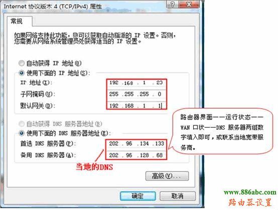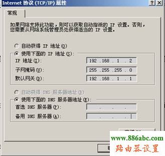 選擇“屬性”→“常規”→“Internet協議(TCP/IP)”,查看其“屬性”,您會看到如下頁面,請按圖所示,填入IP地址192.168.1.2,子網掩碼255.255.255.0,默認網192.168.1.1。點擊該頁面的“確定”及“本地連接屬性”頁面的“確定”。等待系統配置完畢。注意在 “使用下面的DNS服務器地址”中填入當地的DNS服務器地址。