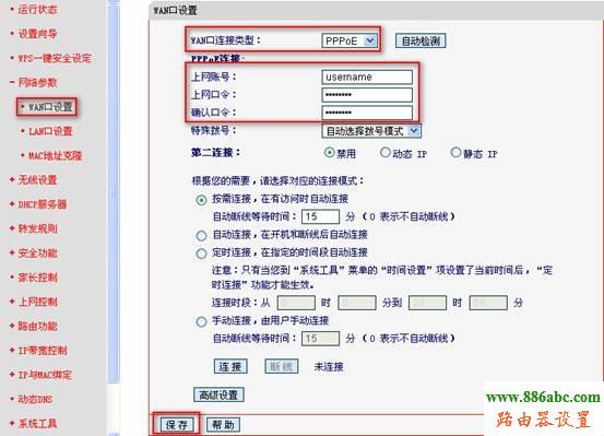 2.在左邊框中選擇“網絡參數”→“WAN口設置”,然后在右邊框中的“WAN口連接類型”選擇“PPPoE”。“上網賬號”和“上網口令”中填入寬帶賬戶的用戶名和密碼。