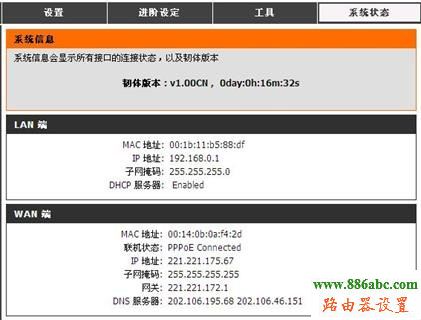 在系統(tǒng)狀態(tài)界面中看到PPPoE已經(jīng)連接上,且路由器的WAN端也獲取到了由電信部門分配的IP地址信息。