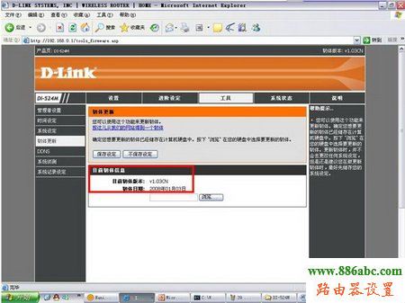首先打開瀏覽器,在地址欄鍵入192.168.0.1,登錄到路由器WEB管理界面(默認狀態下用戶名為admin,密碼為空),進入配置界面后,點擊上面“工具”菜單,然后點擊左側的韌體更新按鈕。在該界面下,可以看到目前所使用的韌體信息。