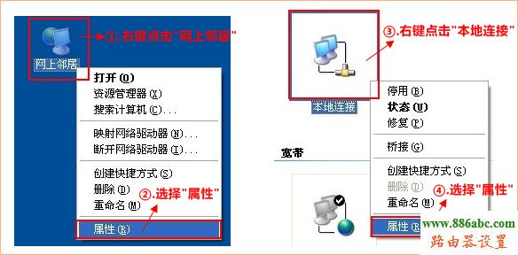 1、右鍵點擊桌面上的“網(wǎng)上鄰居”,按如下操作打開本地連接屬性: