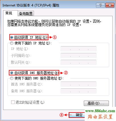 3、選擇“自動獲得IP地址”“自動獲得DNS服務(wù)器地址”,“確定”即可: