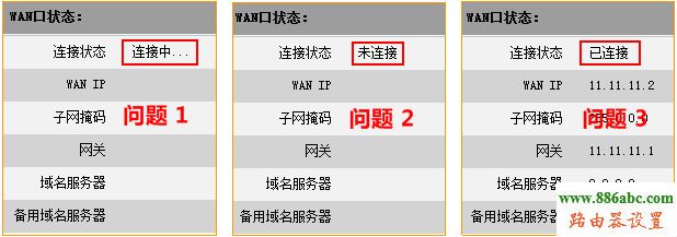 設(shè)置完成后,若還不能訪問因特網(wǎng),請查看系統(tǒng)狀態(tài)下的WAN口狀態(tài)并參考下面的問題描述排查